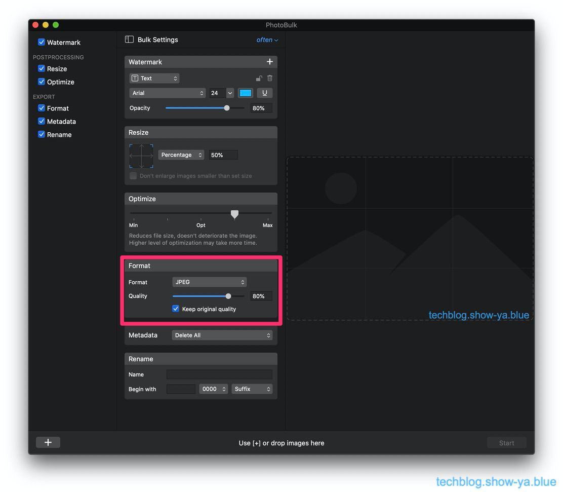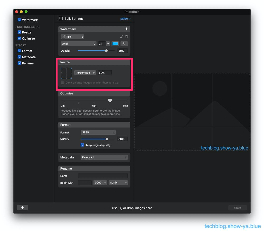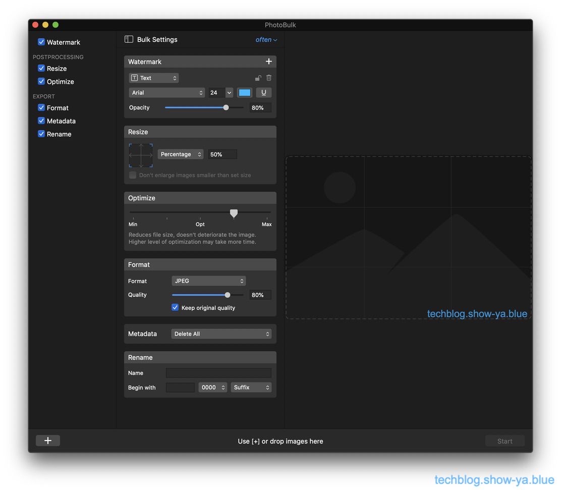 Macで撮った写真はそのまま使ってもいいんですが転載防止のためにウォーターマークを入れたりサイズをブログ用に調整したり画像をリファインしたりフォーマットを変えたりメタデータを削除したりリネームしたりすると便利なんですが、それらの処理を一括で行ってくれるソフトウェアです。