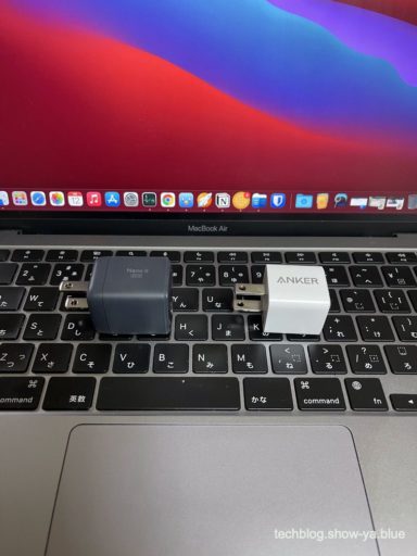 30Wという事はM1搭載MacBookAirを普通に充電できるスペックなのですが、信じられない事にAnkerの20Wの充電器をほんの1周り大きくしただけのサイズなのです。